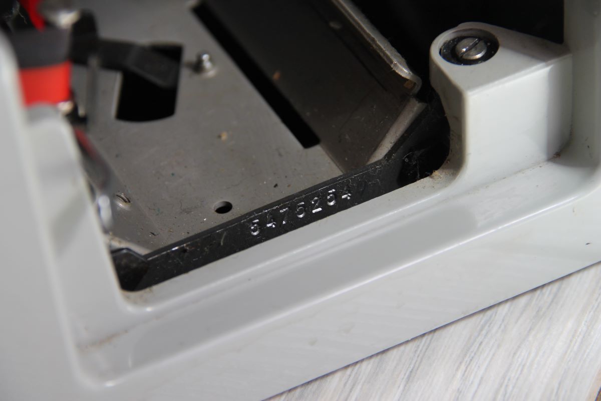 La machine que nous avons déniché est en parfait état. Elle a été conçue entre 1970 et 1971 à Barcelone en Espagne. Elle possède encore sa sacoche. Composée de tissu plastifié sur une base cartonnée et renforcée elle a permis de conserver la machine dans un bon état. Son clavier est de type AZERTY, il comprend une barre d’espace, ainsi que deux boutons pour activer et désactiver la majuscule. Il fonctionne avec des leviers de pression d’écriture, à chaque pression sur une touche, le marteau correspondant va battre sur la bande avec l’encre noire ou rouge qui va ensuite permettre l’impression du caractère sur le papier.